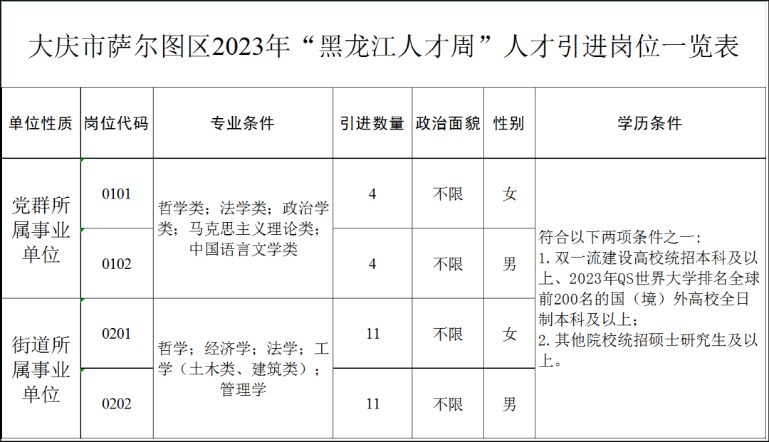計劃引進黨群所屬事業(yè)單位工作人員8人,街道所屬事業(yè)單位工作人員22人,具體引進崗位、數量要求詳見《薩爾圖區(qū)2023年“黑龍江人才周”人才引進崗位一覽表》(見附件)。