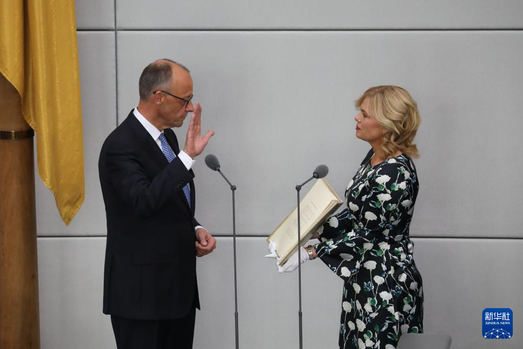 5月6日,在德國首都柏林的國會大廈,默茨(左)宣誓就職。